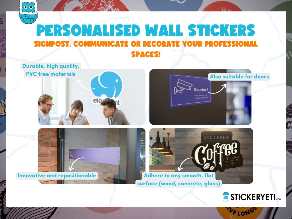A wall sticker is more than just a sticker. It's a piece of adhesive specially designed for signposting, communicating or decorating workspaces. Custom printed in an infinite variety of shapes, sizes and designs, Stickeryeti's personalised wall stickers are made from high quality materials that guarantee durability and ease of application and removal.